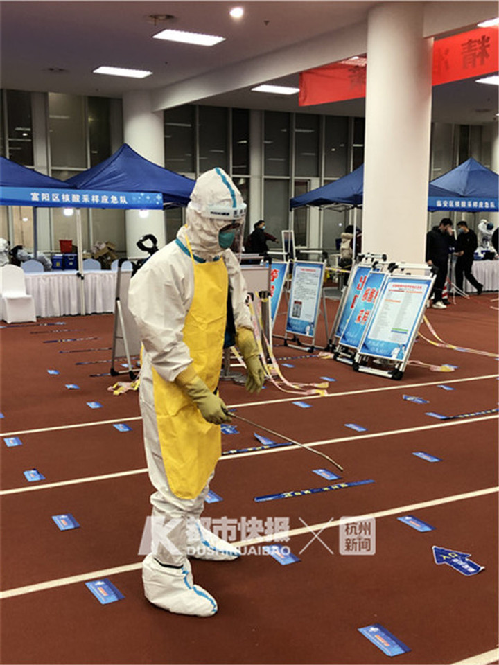 富阳区应急队核酸采样结束,工作人员正在对现场进行消毒工作。