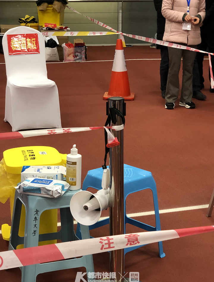 在建德市核酸采样应急队入口处,挂着一只扩音喇叭,循环播放着“请大家配合亮码测体温,保持一米线距离,请有序排队”