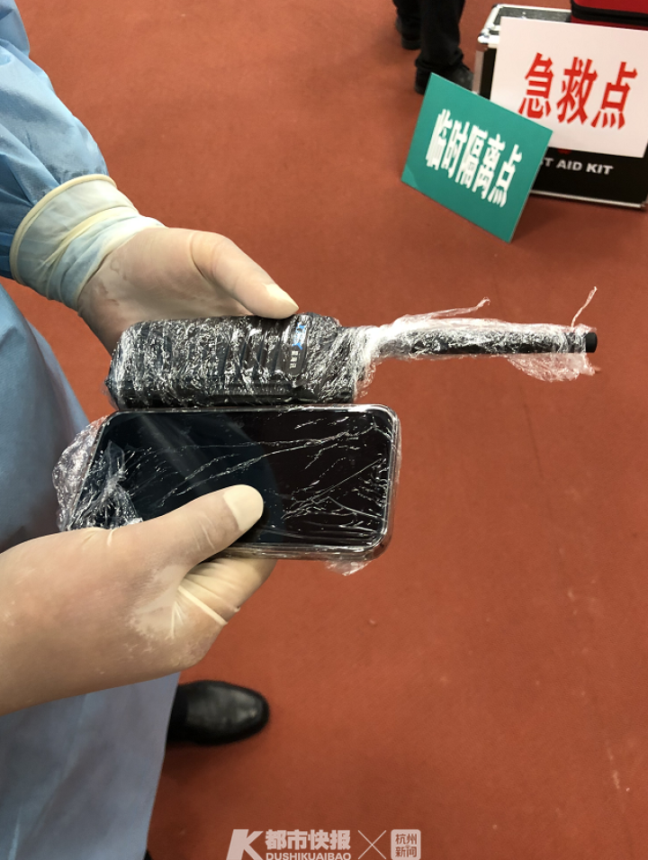 下城区核酸采样应急队引导工作人员的对讲机以及手机等通讯工具都采取了如图的处理措施。
