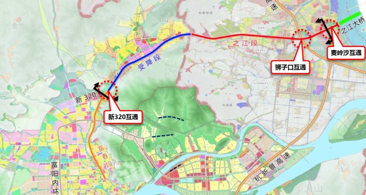 杭富城际线附属工程(彩虹快速路西延工程)路线总体呈东西走向,东起麦岭沙互通,西至新320国道以南,全长约17.0公里,其中,西湖区(之江)段长约9公里。