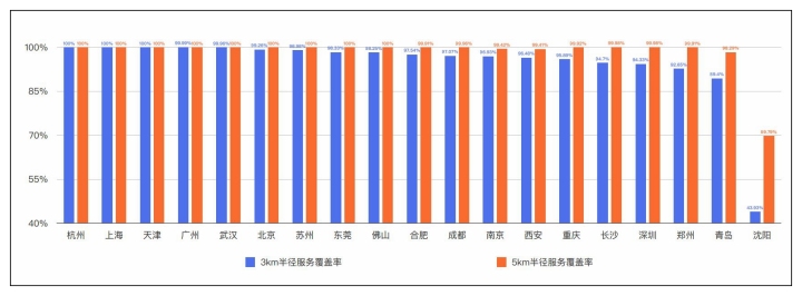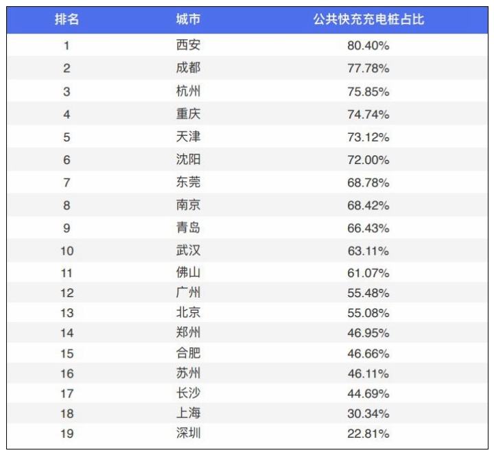 报告还显示,截至2020年底,杭州、上海和天津这三个城市的充电站3公里半径服务覆盖率和5公里半径服务覆盖率,双双达到100%,并列第一。而主城区公用充电桩的快充充电桩占比最高的前三个城市,分别为西安(80.40%)、成都(77.78%)和杭州(75.85%)。