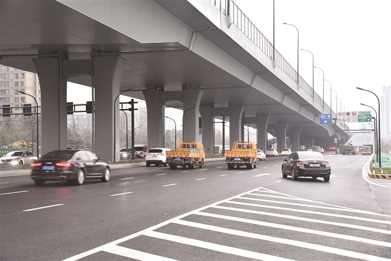 昨日下午,随着路口围挡拆除,我区彩虹大道(通惠路—沪昆铁路)等9条城市“断头路”将迎来分时开通,总里程约11公里。图为风情大道(金城路—建设二路)地面道路。记者 范方斌 摄