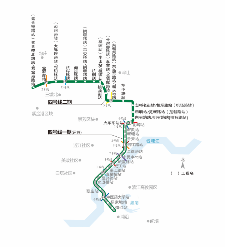 杭州地铁4 号线二期工程起于一期工程终点站(彭埠站),线路沿鸿泰路—明石路—兴业街—新天地街—东新路—沈半路—桃源街—平炼路—京杭运河—良运街—金昌路—池华街,止于西湖区三墩紫金港路站,全长 24.1公里,设车站15座。