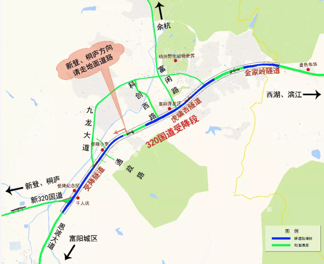 杭富城际铁路附属配套工程(彩虹快速路西延)与地铁6号线、320国道共线位,隧道位于地铁上方,320国道下方,从富阳往杭州方向分别为受降隧道、虎啸杏隧道、金家岭隧道。富阳城区往杭州主城区方向机动车从受降隧道(银湖街道大树下自然村)入口处驶入隧道,在富阳区与西湖区交界的金家岭隧道出口处驶离隧道;杭州主城区往富阳城区方向机动车从金家岭隧道入口驶入隧道,在受降隧道出口处驶离隧道,进入恩波大道。