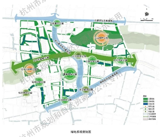 单元整体形成“一轴、两园、三带、多点”的整体空间景观结构。其中:“一轴”:指以彩虹快速路的门户形象展示轴;“两园”:指北干山郊野公园、长山郊野公园;“三带”:指长山直河活力景观带、萧绍运河文化景观带和北塘河生态景观带;“多点”:指由均衡的分布在单元内的多处中小型公园构成的绿化景观节点,包括高铁中央公园、站场迎宾公园、公共庆典公园及多处邻里公园。