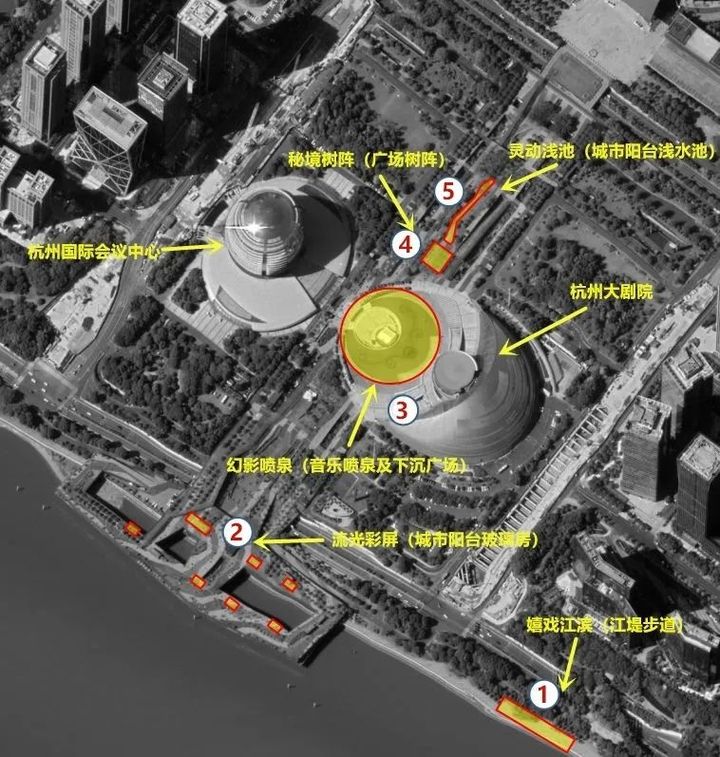 各景点具体位置如下:城市阳台江堤步道、音乐喷泉及下沉广场、浅水池、广场树阵、阳台玻璃房。