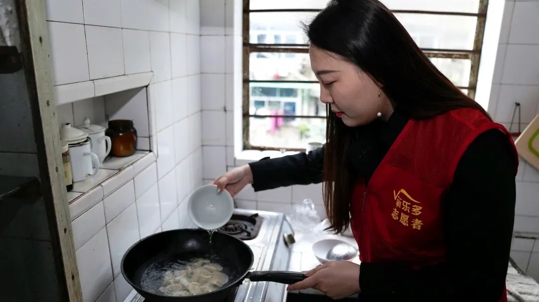 带来了老人想吃的水果,打扫了一下卫生,跟年过八旬的尹云花唠唠嗑,了解老人还有什么特别的需求,趁着上午有太阳,还给老人的被褥晒了一遍,一直忙到中午。临走前,舒鑫还不忘给老人做了一碗中午吃的水饺。