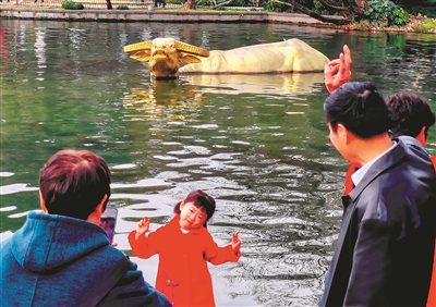 杭州日报讯 “和金牛合个影,我也拍张牛照,牛气外露!”牛年到了,许多市民游客到了西湖,就喜欢到涌金池,和池里的大金牛合影。 相传在汉代,西湖底有金牛潜伏,逢湖水干涸,牛即涌现,吐水将湖填满。地方官吏为讨皇帝欢心,命百姓抽干湖水,水干之时果见金牛,官吏们争先恐后下湖捉牛,金牛昂首怒吼,张嘴吐水,顷刻官吏们全被淹没了!从那以后,西湖水不再干涸,金牛也不再出现。 2003年西湖南线整治时恢复“涌金池”景观,增加“涌金池”刻石。