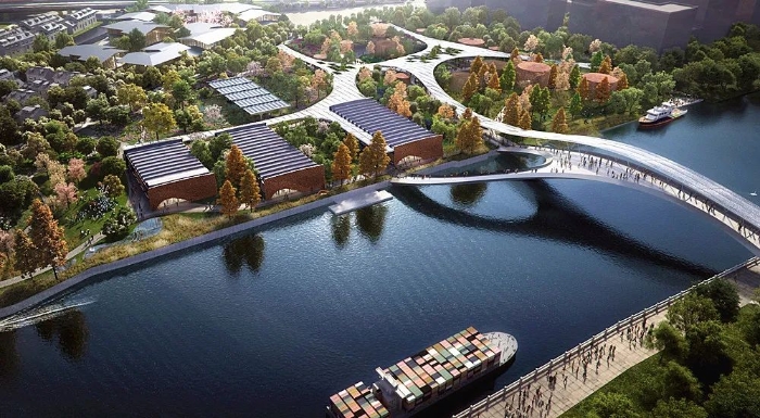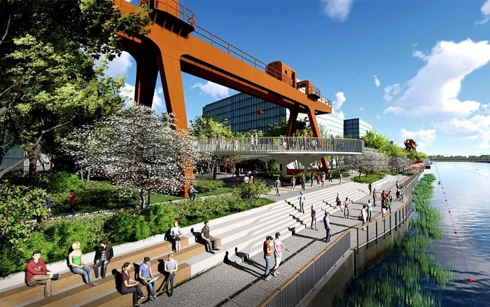 项目整体风貌定位以工业印记与现代艺术融合为主题,目标是打造“世界级滨水人居文明典范”,呼应当代城市滨水人居新需求,沿承杭州大城北发展新定位,建设面向新时代的城市滨水公共空间。