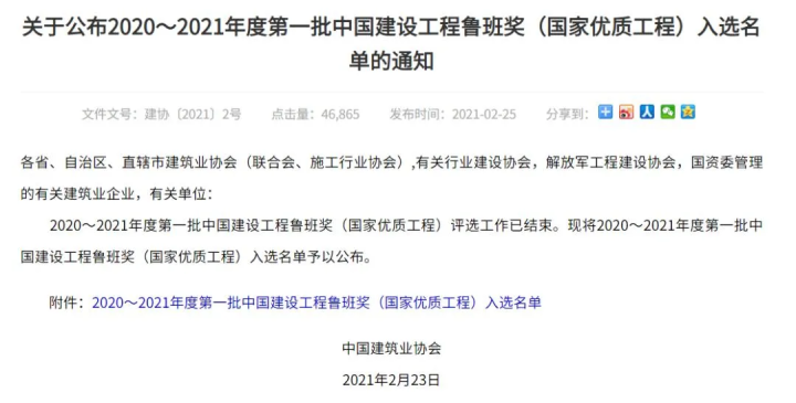 近日,2020-2021年度第一批中国建设工程鲁班奖(国家优质工程)入选名单公布,杭州奥体中心主体育场工程入围。