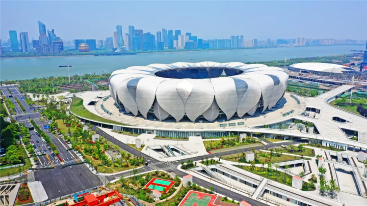 杭州奥体中心主体育场,场馆造型取意于古老丝绸纹理与编织体系,建筑体态源于钱塘江水的动态。屋顶由28片花瓣构成,看起来动感飘逸,市民亲切称之为“大莲花”。