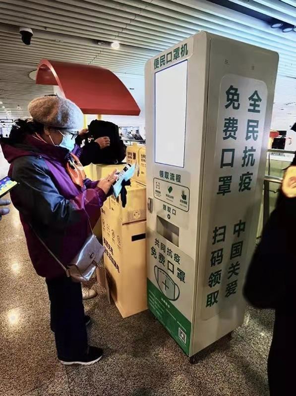 记者在东广场G层长运公路汽车站门口看到,这里就有一台免费口罩机矗立着,一旁还有专人站岗的服务台,恰巧有一位女性旅客正在领取口罩。只见她领取流程简单易操作,根据系统提示用微信扫一扫10秒左右就有一只免费口罩出仓。