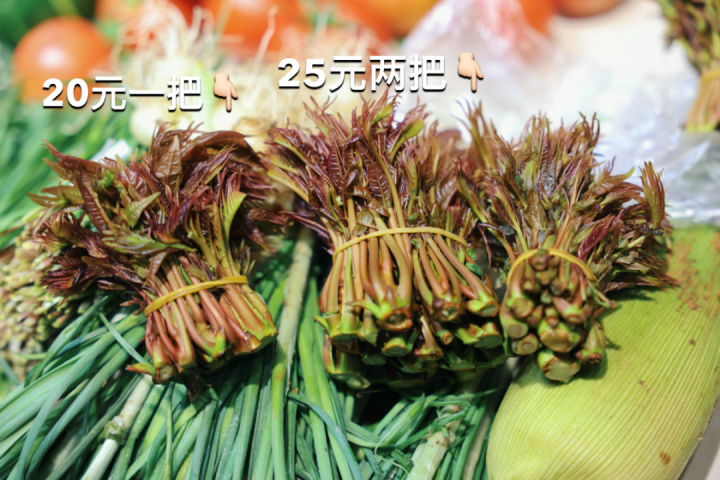 有香椿的菜摊有好几个,都是按“把”卖,而不是按斤报价。一把的分量也略有不同,一般是一两,多的也不会多过二两,因为香椿跟其他菜不同,只要一小把就能做出一只菜,按把买吃个新鲜倒是正好。再者说,一把的价格听上去也没那么“吓人”了,比如我们问的那几家,一家是一把20元,看我一脸买不起的表情,老板说旁边有便宜的,25元两把。