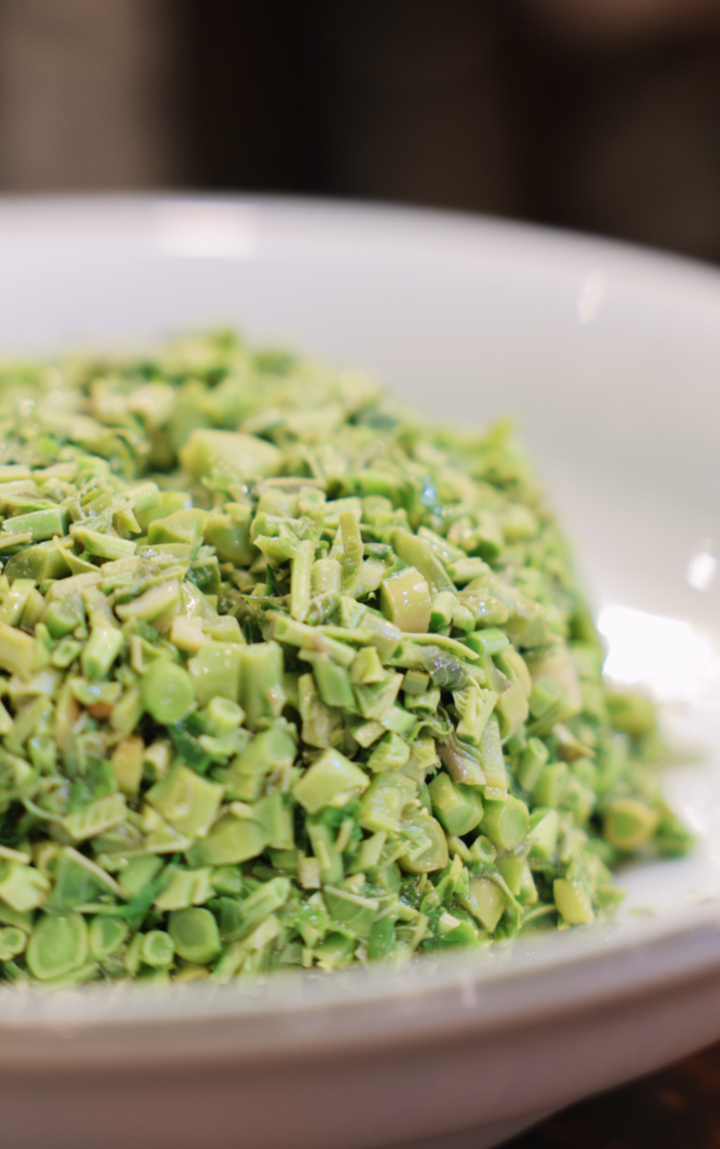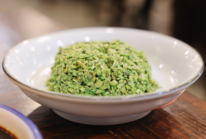 福缘居的凉拌香椿是参照凉拌马兰头的做法,即焯水后将香椿切碎装盘的,我觉得可以跟他们的厨师再探讨一下,如果是很嫩的嫩芽,也可以不切碎,就这样原株凉拌,形如凤尾,味如仙草,漂亮又清新。