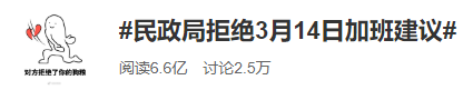 近日,#民政局拒绝3月14日加班建议#登上了微博热搜,目前阅读量6.6亿,讨论量2.5万。原来是有网友在人民网地方领导留言板中留言,希望怀宁县民政局能在2021年3月14日(周日,谐音爱你爱一生一世)临时开门,实现新人们在好日子结婚领证的意愿。安徽怀宁县民政局回复称,2021年3月14日为法定节假日,婚姻登记处不予加班办理婚姻登记。