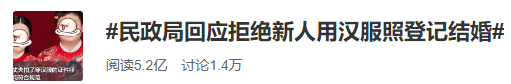 #民政局回应拒绝新人用汉服照登记结婚#登上了微博话题热搜第二名。说的是江苏省无锡市的唐女士是一名汉服爱好者,此前她发现其他城市出现过汉服照登记结婚成功的例子,于是和丈夫拍了汉服证件照,尺寸背景等符合婚姻登记照规范。但遭到了当地民政局的拒绝,拒绝理由是:此前无锡没有先例,因此未予同意。