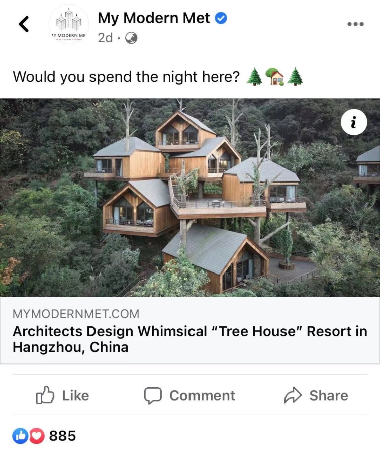 除了官网,My Modern Met还在多个海外社交平台上转发了皮雷斯的文章,湘湖的这片树屋迅速俘获了海外网友的心。