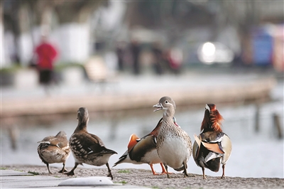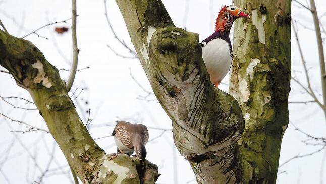 杭州日报讯 近日,在西湖边北山街一带,不时可见一对对鸳鸯飞到高大的梧桐树上东张西望,寻找树洞并探个究竟。原来,时下的鸳鸯即将进入繁殖期,平日里群栖在西湖湖面上的鸳鸯们在找好“对象”后,就开始一起到湖边的树上找个合适的树洞当“新房”,准备筑巢产蛋,繁育下一代了。