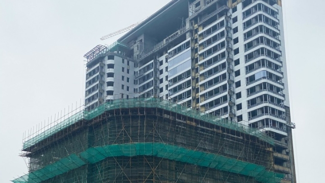 商业裙楼进度看上去要慢一些,建筑脚手架和绿网还未拆除。