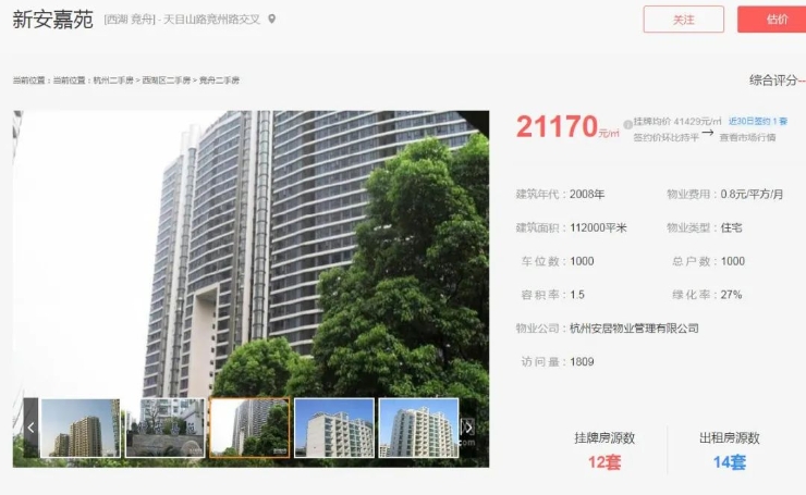 新安嘉苑是距离最近的选项,它就位于古墩路与天目山路交叉口,到西溪路517号直线距离980米,同属于西湖区古荡街道,建造于2008年,目前市场挂牌均价41429元/平方米。