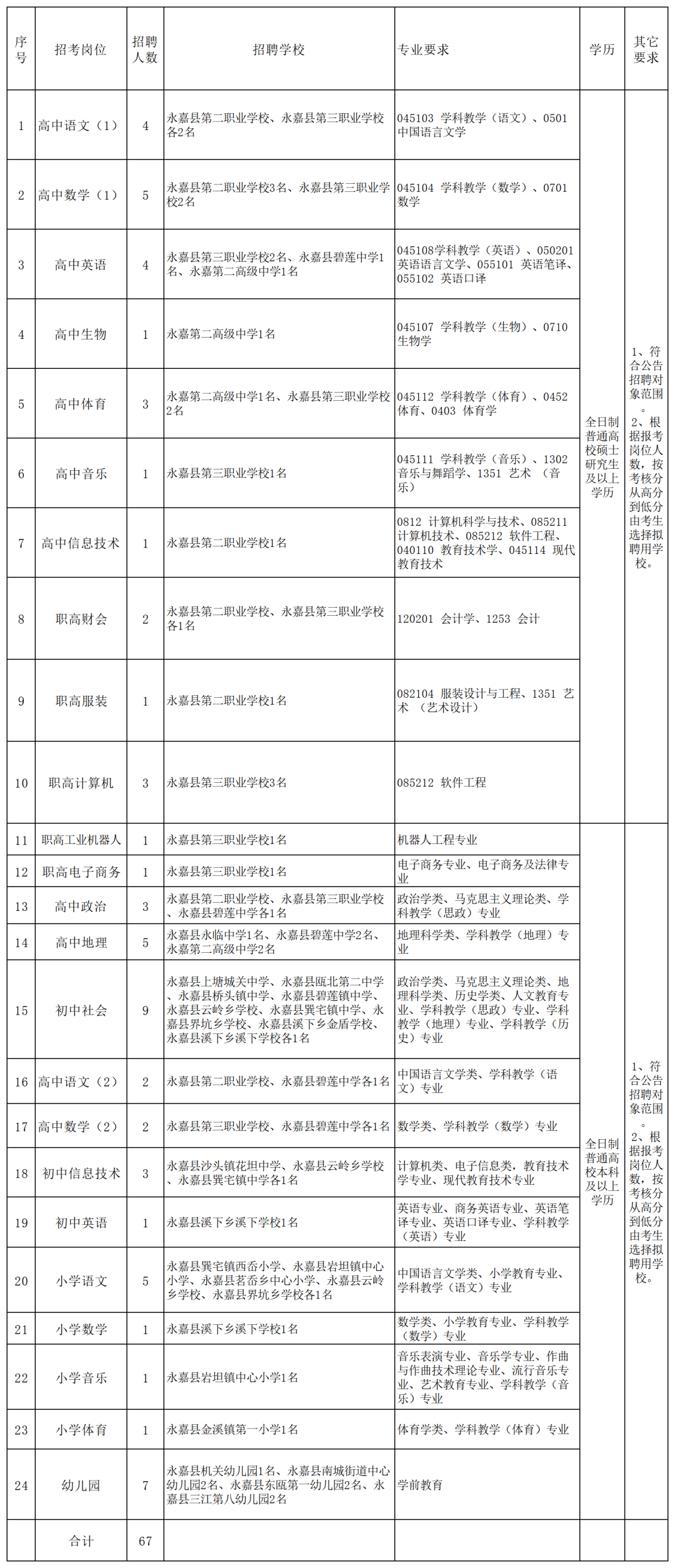 永嘉县教育系统提前公开招聘中小学、幼儿园教师67名。