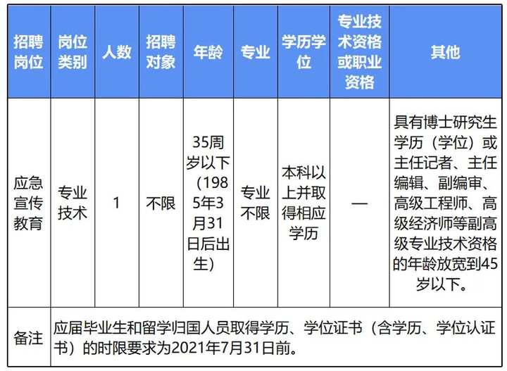 浙江省应急管理宣传教育中心为浙江省应急管理厅直属公益二类事业单位,主要承担全省应急管理宣传教育、考试培训等工作。单位位于杭州市区。本次招聘需求为1个岗位1人。