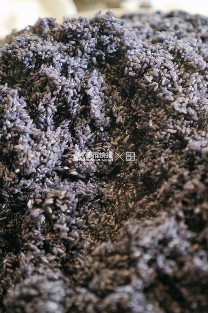 汁水榨出来还不能直接用,老板娘说,煮饭之前,最好把糯米在汁水里泡上一夜,这样就黑了,然后再上锅蒸。年轻的我又疑惑了,直接用电饭煲不行吗?老板娘又笑了,“最好用蒸的!用电饭煲不好控制水份,容易煮烂。”