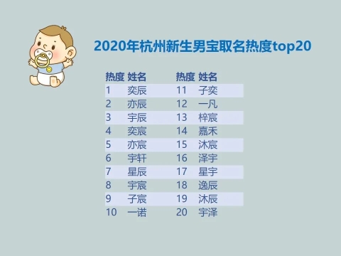 基于2020年落户新生男宝的数据,最热的三个名字分别是“奕辰”“亦辰”“宇辰”。其中,“奕辰”“亦辰”均占新生男宝名字的0.27% ,1万个男宝里27个叫“奕辰”。