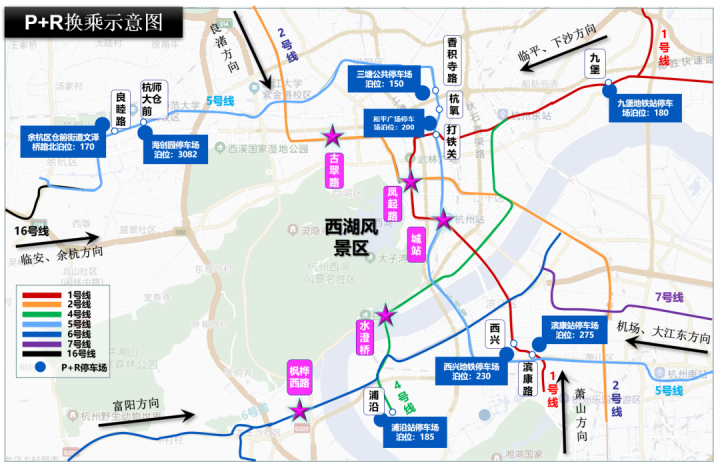 此外,杭州交警倡导游客绿色出行,乘坐公共交通进入景区。可将车辆停放至P+R停车场或直接乘坐地铁至西湖景区周边站点,换乘景区公交线路前往西湖景区。