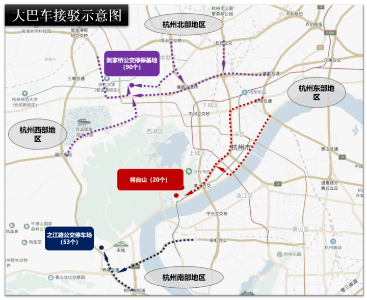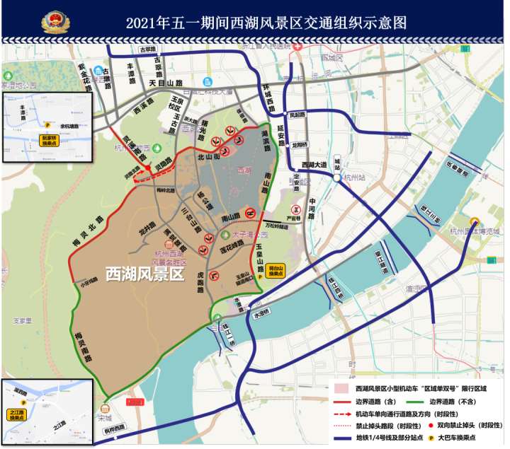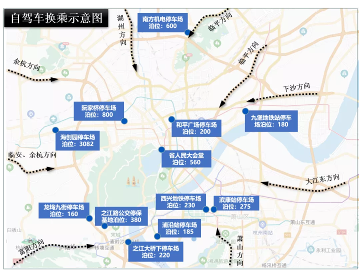 小客车驾驶员朋友也可在下图所示的入城口及西湖周边停车场进行换乘。