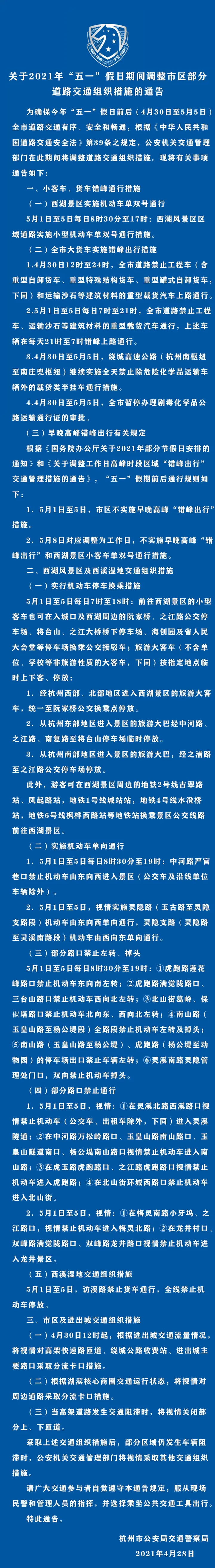 自4月30日起至5月5日,全市道路将分时段、分车种实施客、货车错峰通行措施, 请广大交通参与者自觉遵守相关规定。5月8日对应调整为工作日,不实施早晚高峰“错峰出行”和西湖景区小客车单双号通行措施。