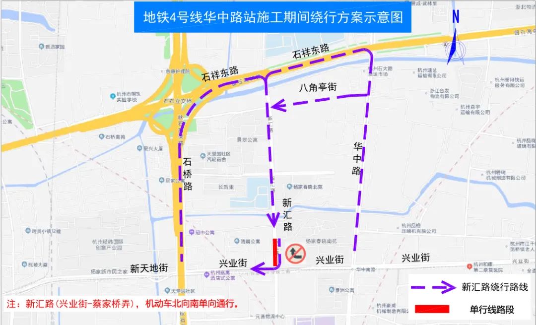 即日起,新汇路(兴业街至蔡家桥弄段)机动车实施由北向南单向通行交通组织措施。受限车辆可以选择华中路、石桥路等周边道路绕行。