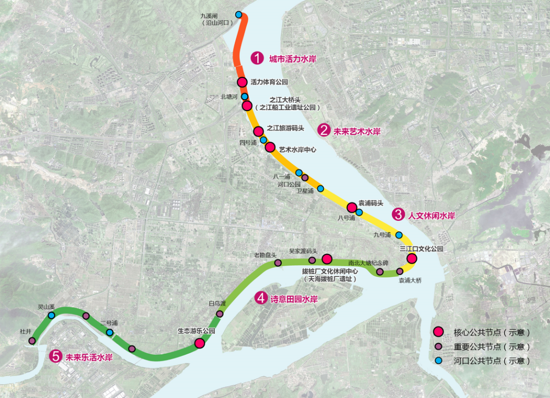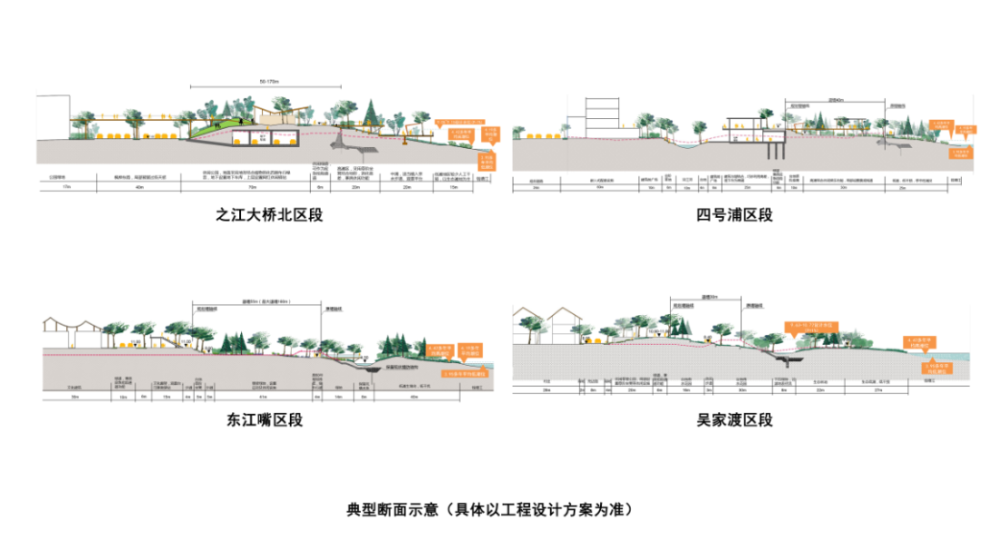 在之江大桥北区段的典型断面示意中,我们看见由钱塘江边向陆侧,依次分布为低滩地区、中滩、高滩区、休闲绿道、休闲公园等区域。