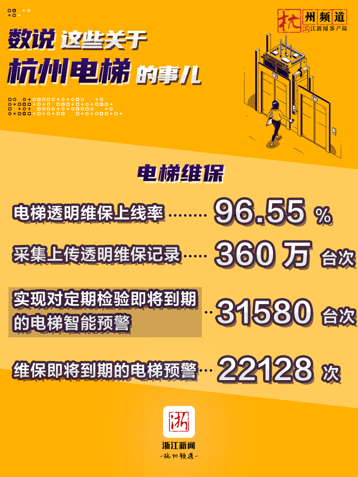 作为全国首批开展电梯智慧监管试点的四个城市之一,杭州依托自主开发的“电梯安全通APP”和“电梯智慧监管平台”,全市电梯维保单位实现在线信息公开,电梯透明维保上线率达96.55%,采集上传透明维保记录360万台次。同时,该系统实现对定期检验和维保即将到期的电梯智能预警,大幅减少了电梯超期维保和超期检验情况发生。