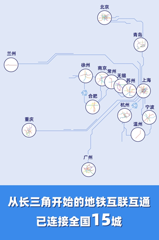 2019年7月,上海和青岛实现地铁互联互通。2019年12月,长三角十城地铁实现互联互通。上海,杭州、宁波、温州、合肥、南京、苏州、无锡、徐州、常州10城实现地铁一码通行。市民只需打开上海Metro大都会地铁app,就可以在这10个城市扫码过闸。