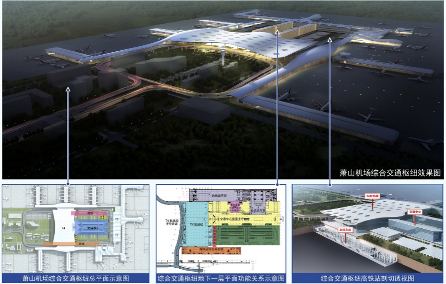 萧山机场站规模为2台4线,位于萧山国际机场T4航站楼下方,旅客出高铁站后可步行至航站楼内。新设的江东站、海宁南站将按照站城融合一体设计的理念,建设成为生产、生活、生态高度融合的现代化高铁新城。