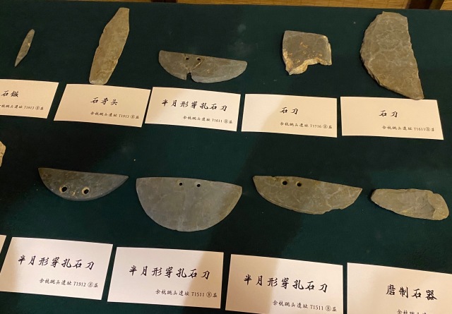 会议室的几张桌子上,放满了出土文物。陶鼎、陶纺轮、原始瓷碗、铜镞、铜刀、铜矛、石锛、穿孔石刀、石斧等,“没想到,小小一块地,居然出土了如此丰富的文物。”一位随行专家感叹道。