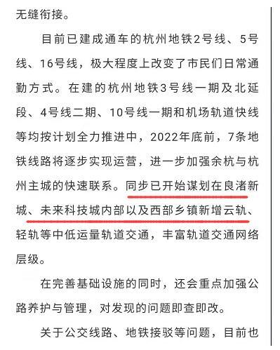 “同步已开始谋划在良渚新城、未来科技城内部以及西部乡镇新增云轨、轻轨等中低运量轨道交通,丰富轨道交通网络层级。”