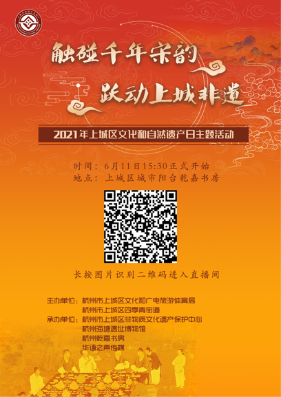 2021年6月12日是我国第16个文化和自然遗产日。为进一步提高人民群众非物质文化遗产保护意识,传承、弘扬中华优秀传统文化,6月11日下午,杭州市上城区文化和广电旅游体育局、杭州市上城区四季青街道主办了以“触碰千年宋韵,跃动上城非遗”为主题的文化和自然遗产日活动。