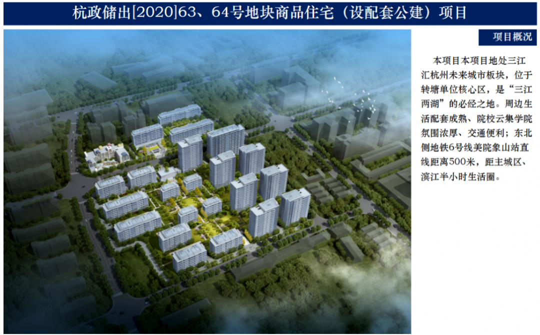 产业发展项目5个,其中麦岭沙留用地项目依托之江度假区重要区位,定位为之江板块商务办公高地,涵盖特色商务办公、酒店及配套商业等功能,全面承接优质人才和总部项目落地。杭政储出[2020]63号、64号地块为住宅设配套公建项目,配有幼儿园、社区用房、养老用房、社区卫生服务站等公共设施,完善周边基础配套。