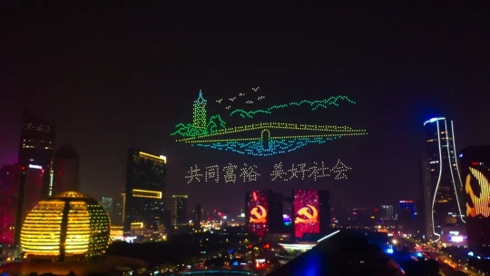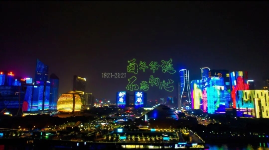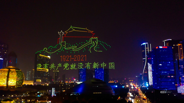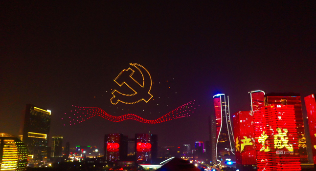 1000架无人机光影交错,呼应演绎奋斗百年路。“百年华诞不忘初心”、“没有共产党就没有新中国”、红船精神的演绎以及共产党党徽等文字图案展现着中国革命的波澜壮阔。