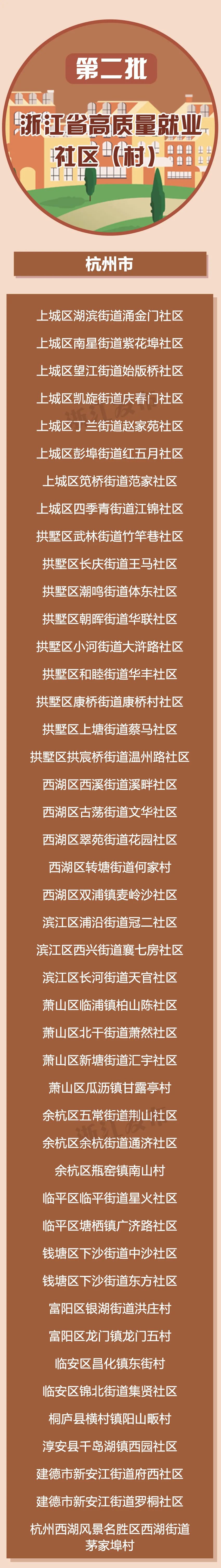 浙江发布消息 近日,浙江省人力资源和社会保障厅公布了第二批高质量就业社区(村)名单,确定杭州市上城区湖滨街道涌金门社区等322个社区(村)为第二批浙江省高质量就业社区(村)。有你家乡么?一起来看↓↓