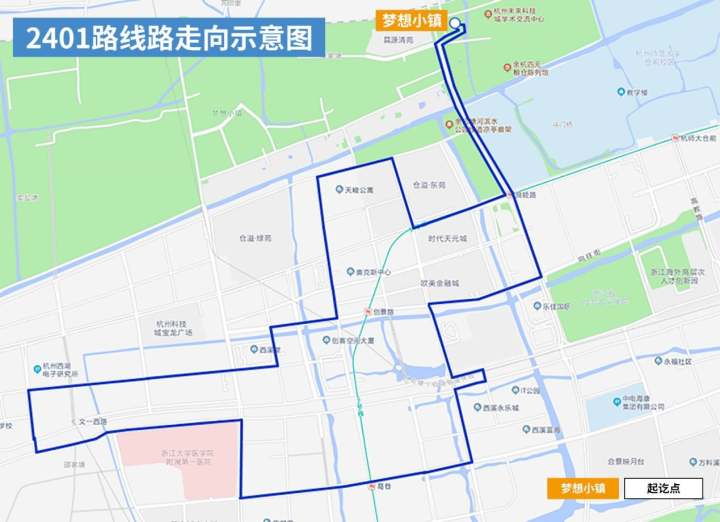 2401路(梦想小镇-梦想小镇),未来科技城客流增长迅速,但服务于区域内中、短距离出行的公交线网尚未形成。与788路类似,2401路过于追求“大而全”,未考虑乘客的出行习惯。如:仓溢东苑前往创景路地铁站无法直接到达,很不便捷;未来科技城的核心区域(EFC附近)前往浙一总部需从龙潭路绕行。