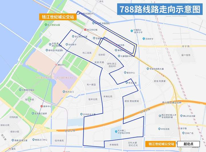 788路(钱江世纪城公交站-钱江世纪城公交站),线路迂回系数高,未考虑乘客流向问题,看似连接了很多住宅、楼宇和地铁站,但实际乘坐起来存在绕行多、用时长等问题。“三城融合”线路开通后,该线原有功能已被791M、792M路所替代,后期随着博奥隧道的通车,新增533、537路也将取代788路的服务功能。