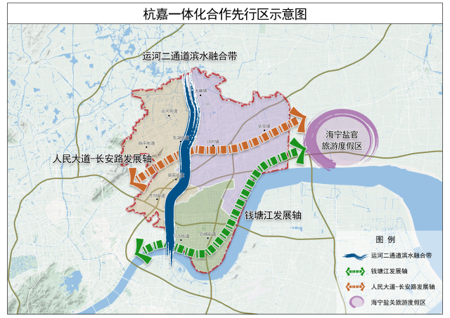 杭嘉一体化合作先行区以新型城镇化为特色,构建“一带两轴(运河二通道滨水融合带、钱塘江发展轴、人民大道-长安路发展轴),相向融合”的同城发展格局,打造高品质产城人文融合新典范、先进制造业和现代服务业深度融合发展新样板、生态海岸带一体化融合新示范。