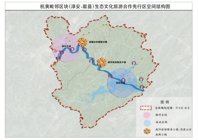 根据方案,杭黄毗邻区块(淳安、歙县)生态文化旅游合作先行区将立足杭州市淳安县和黄山市歙县,聚焦淳安县千岛湖西北临湖板块五个乡镇(威坪镇、鸠坑乡、宋村乡、金峰乡和梓桐镇)、歙县新安江沿线五个乡镇(街口镇、小川乡、新溪口乡、武阳乡和深渡镇),重点做强威坪镇、深渡镇两个关键节点,规划面积约1100平方公里。