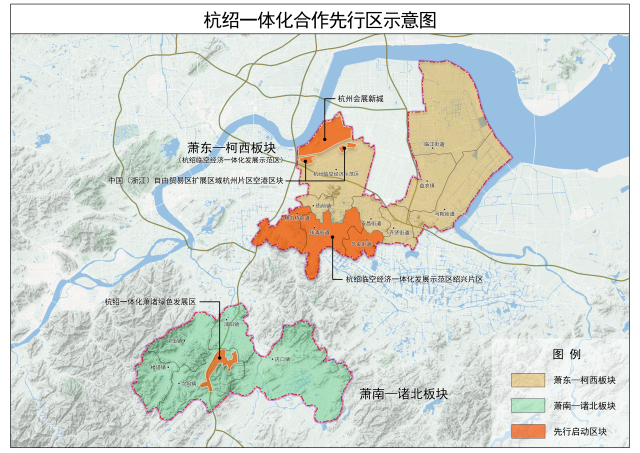 杭绍一体化合作先行区分为萧东—柯西和萧南—诸北两个板块,包括杭州临空经济示范区、钱塘区临江街道和萧山区的衙前、益农、浦阳、河上、楼塔五镇,柯桥区的杨汛桥、钱清、安昌、华舍、齐贤、马鞍六街道,诸暨市的次坞镇、店口镇等乡镇街道,规划面积约1080平方公里。