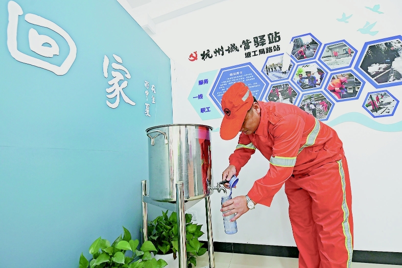 昨日中午,环卫工人在杭州城管驿站塘工局路站休息。记者 李忠 张之冰 摄