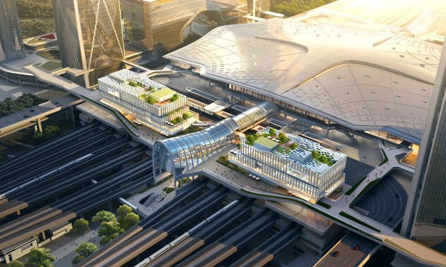 杭州西站枢纽雨棚上盖开发项目是浙江省政府和国铁集团实现“路地合作”的全国首个新建高铁站雨棚上盖商业开发项目,也是展现杭州西站枢纽站城融合开发理念,展示杭州城市形象的窗口示范项目。开发空间分别位于杭州西站枢纽东西落客平台站房雨棚上方四角,规划开发特色酒店、总部办公综合体。出让的西侧地块总用地面积约15532平方米,上海铁路房地产开发经营有限公司与杭州市西站枢纽开发有限公司联合体以总价13867万元竞得,成交楼面价5580元/平方米。东侧地块位总用地面积约15730平方米,上海铁路房地产开发经营有限公司与杭州市西站枢纽开发有限公司联合体以总价9985万元竞得,成交楼面价3967元/平方米。