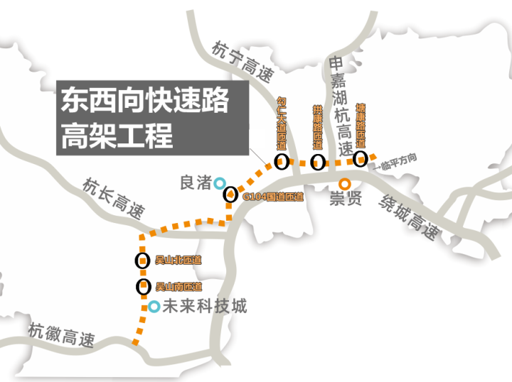 东西向快速路(高架)项目起于临平区崇贤街道与杭州主城区衔接处,顺接秋石快速路疏港互通,终于余杭区西部余杭街道,沿线经过临平区崇贤街道、塘栖镇,余杭区仁和街道、良渚新城、仓前街道、未来科技城、余杭街道等地。